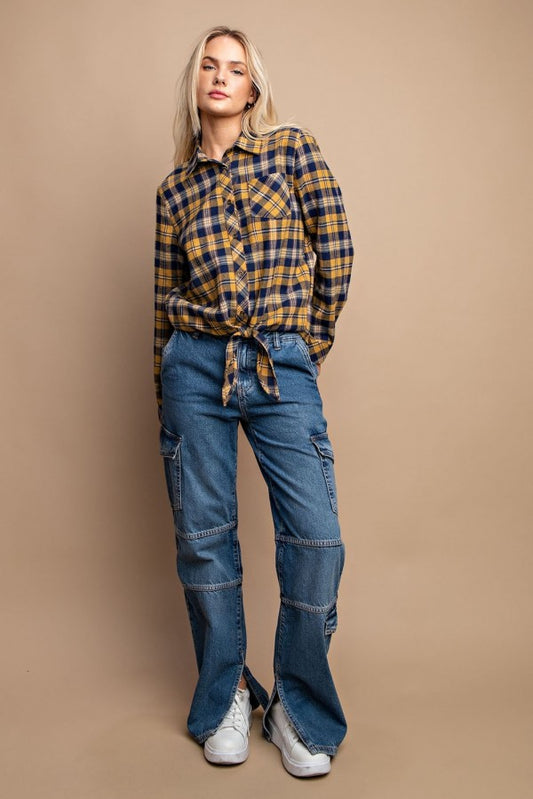 Tie Front Button Down Plaid Shirt With Front Pocket
