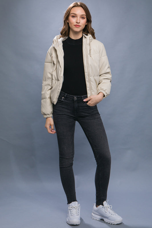 Pu Faux Leather Zipper Hooded Puffer Jacket