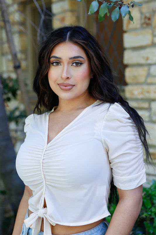 Mesh Button Up Self-tie Detail Ruched Short Sleeve Crop Top
